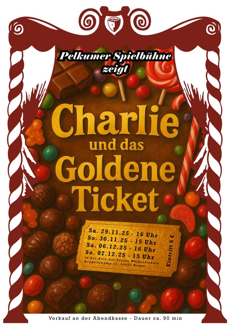 Wir freuen uns sehr, dass unser Mitglied Davina Mathijssen die Regie für eines ihrer Herzensstücke übernommen hat: Charlie und das goldene Ticket. Die bekannte Geschichte über Wonkas Schokoladenfabrik wird sicher viele Kinderaugen aufleuchten lassen. Und Schokolade muss es sicherlich auch geben! Wir freuen uns auf die Aufführungen ab dem 29.11.!