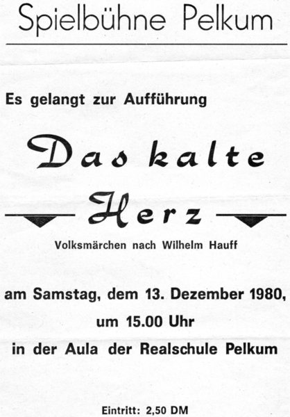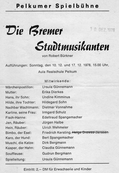 Spieler: Erika Dierkes, Undine Kimminus, Hilde Sohn, Dietmar Vonnahme, Irmgard Schulz, Edeltraut Spangemacher, Jürgen Halbe, Ulli Wehmeier, Friedel Kersting, Bert Spangemacher, Dirk Bergmann, Claudia Günnemann, Ursula Günnemann